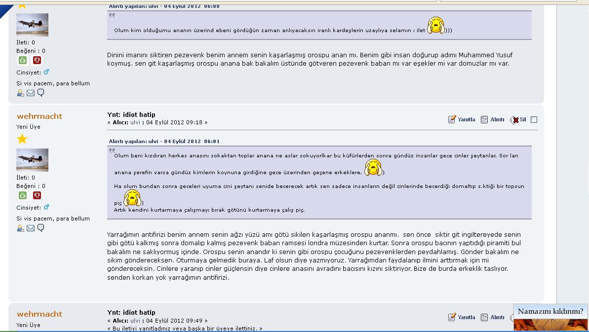 oğlum hatibin(ulvi) bana ettiği bir ton küfür ibneyuvasında da gizlivadide de duruyor. şerefini siktiğimin dümbüğü birde hatip küfür etmiyor diyorsun. götün yiyiyorsa onun ettiği küfürleri de yayınlasana.